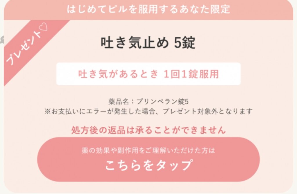 トータル価格(ピル代+診療代+送料)も大事ですが、意外と見落としがちな「吐き気止めの薬が無料」でついてくるかをチェックしてください