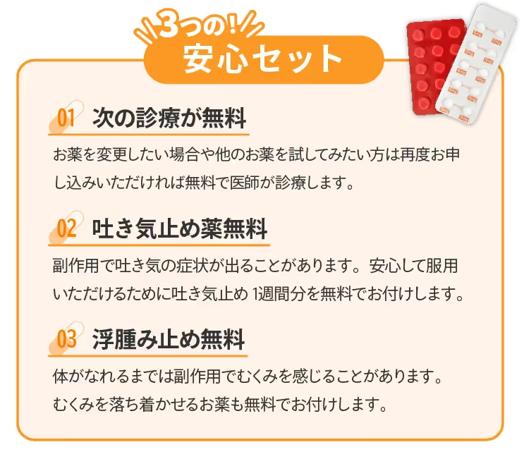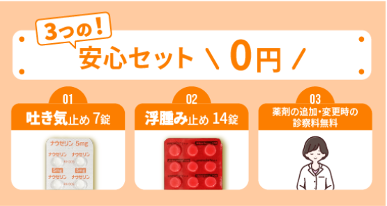 最初から「吐き気止めが無料」で付いてくるクリニックを選べば、手元に届いた瞬間から安心感が違います。