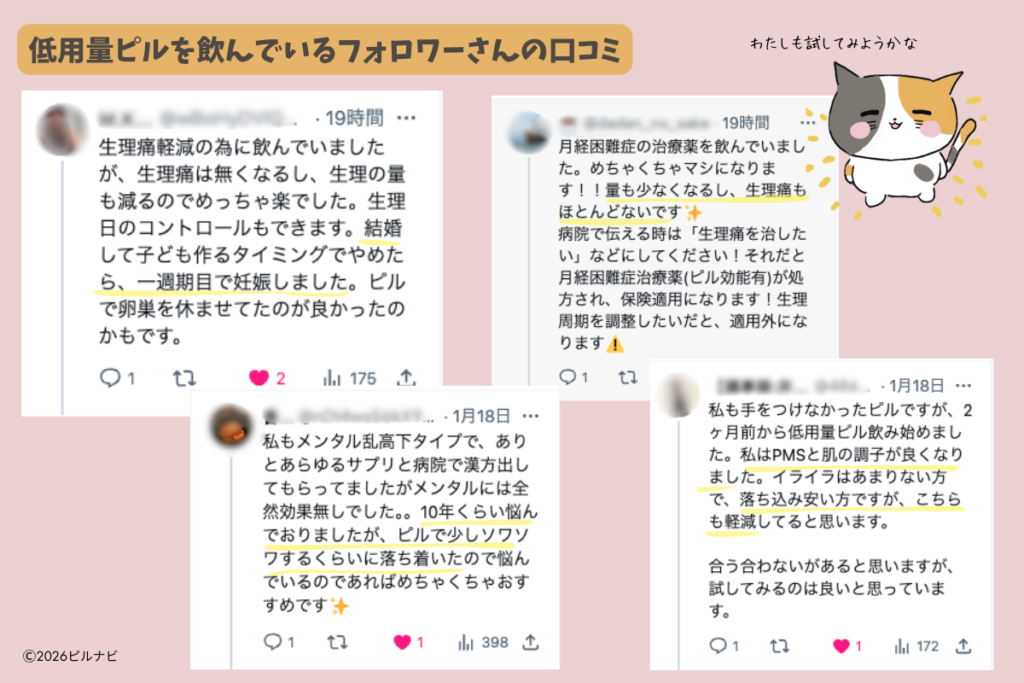 まだ1シート目ですが、特に「生理痛の軽減」「経血量が激減」で早くもピルで生理がかなり楽になっています…!