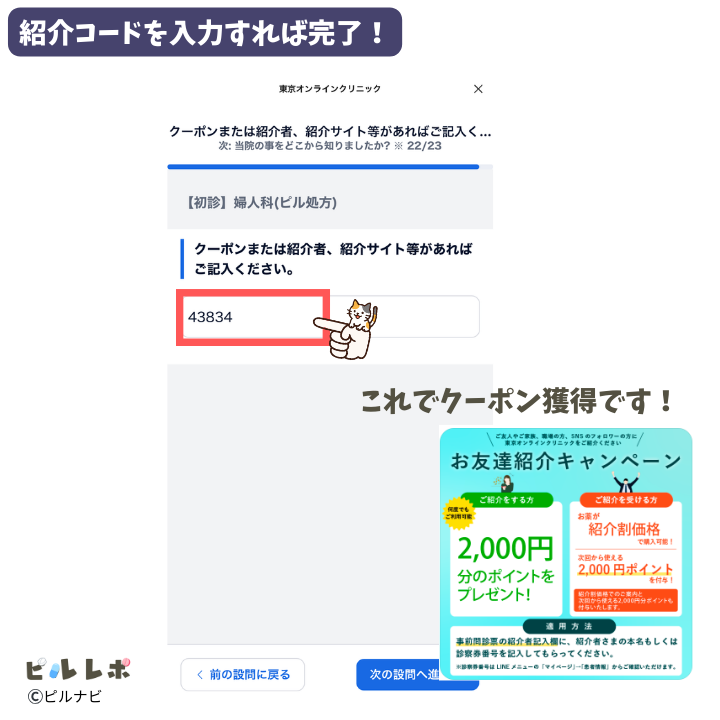 友達紹介コードによる特典はどのクリニックも登録時にコードを入れないとポイントが受け取れません