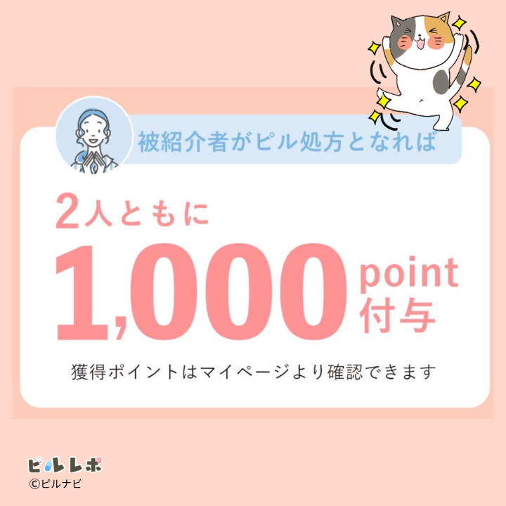 - 友達や家族、またSNSなどで自分の紹介コードが利用されるとピル代に使えるポイントが付与されます