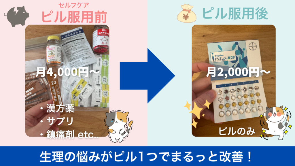 それが今はピルのみになって大量の薬でごちゃごちゃしないし、何だかんだ漢方とかサプリに月4,000円くらい使ってたので、私はピルだけ(月2,000円ほど)になってむしろ節約になりました